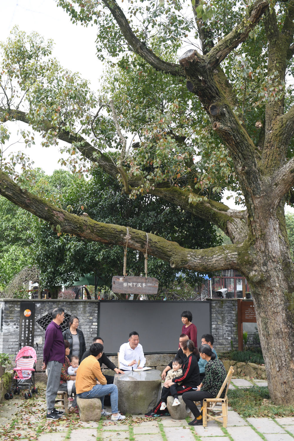 在浙江杭州市余杭區小古城村一株老樟樹下,村民在商議鄉村發展事項(2022年3月14日攝)。新華社記者 翁忻旸 攝