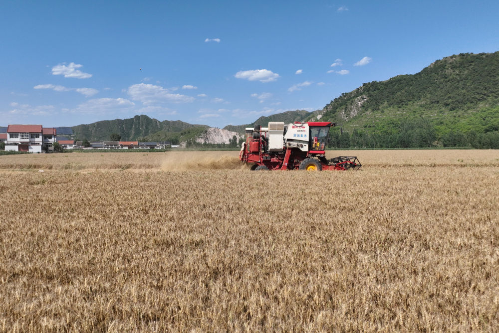 6月21日,收割機在河北省遷西縣興城鎮南莊村收獲小麥(無人機照片)。新華社記者 楊世堯 攝