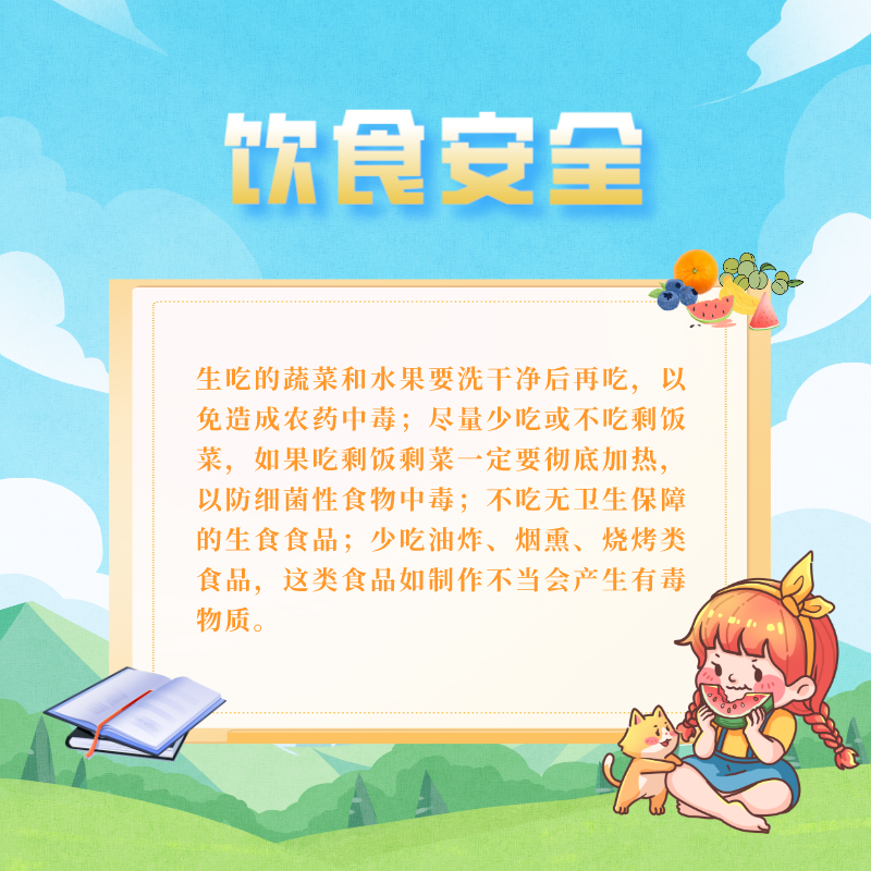 6.飲食安全:生吃的蔬菜和水果要洗干凈后再吃,以免造成農藥中毒;盡量少吃或不吃剩飯菜,如果吃剩飯剩菜一定要徹底加熱,以防細菌性食物中毒;不吃無衛生保障的生食食品;少吃油炸、煙熏、燒烤類食品,這類食品如制作不當會產生有毒物質。