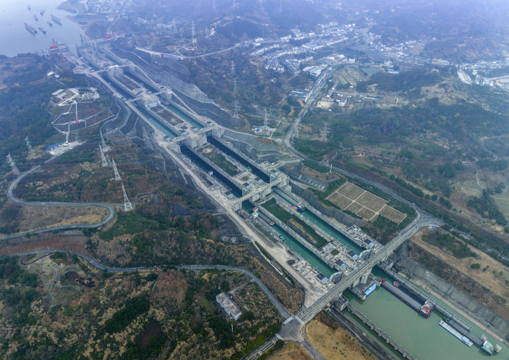 在湖北省宜昌市,船舶有序通過三峽樞紐五級船閘(2023年1月2日攝,無人機照片)。新華社發(王罡 攝)