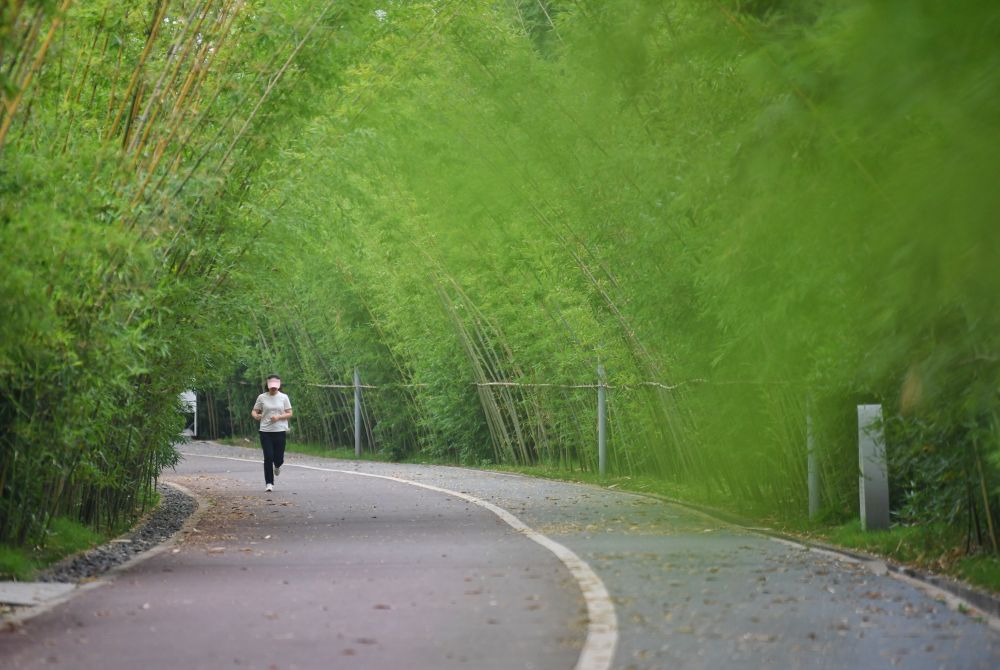 在四川省宜賓市江安縣長江竹島,市民在由河中村改造成的綠色生態公園里跑步(2023年5月31日攝)。新華社記者 劉坤 攝