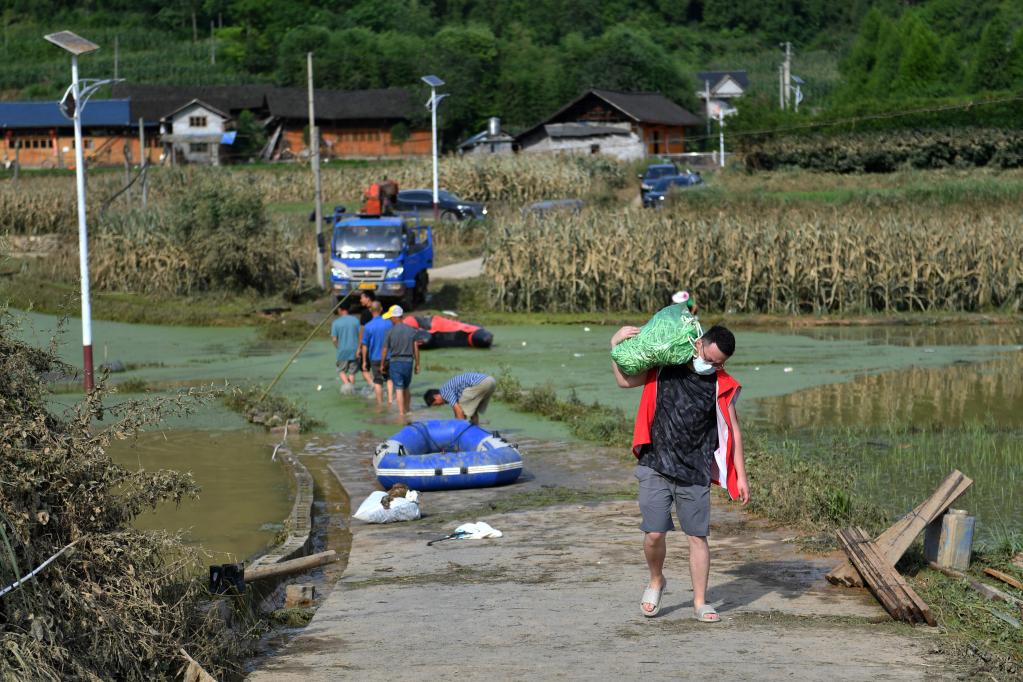 7月3日,在湖南湘西州保靖縣陽朝鄉猛科村,志愿者在搬運救災物資。新華社記者 陳振海 攝