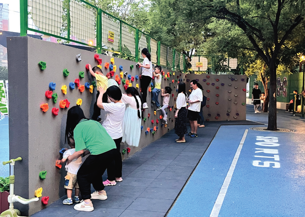 北京石景山區五芳園健身苑“護苗”基地的攀爬墻處,家長正陪伴孩子攀爬玩耍(2023年6月18日攝) 劉淏煜攝 / 本刊