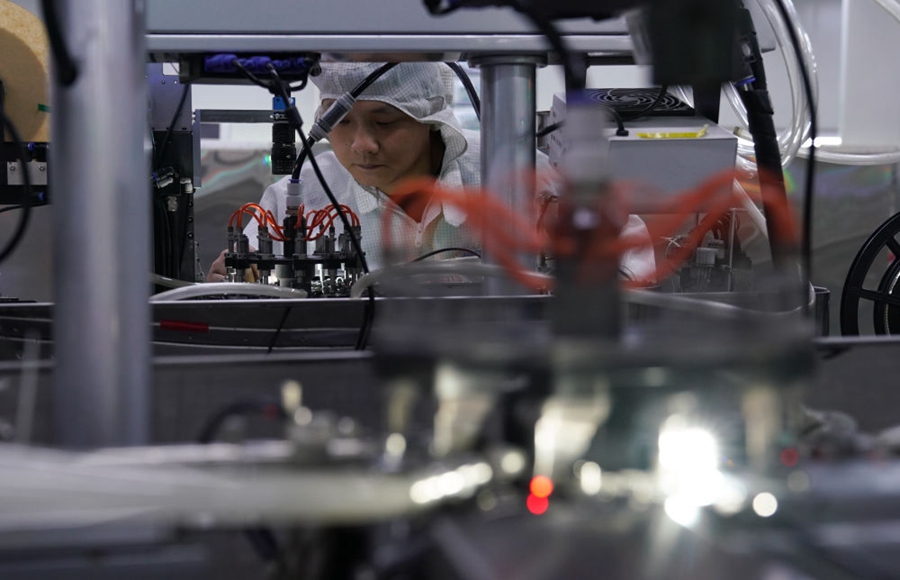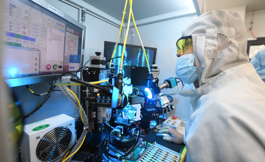武漢光谷,技術人員在光模塊生產線作業 程敏/攝