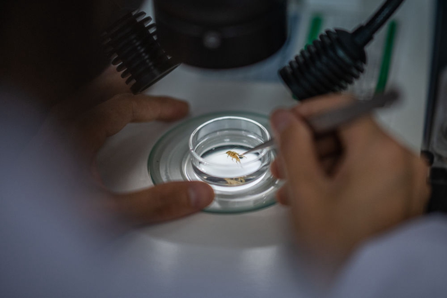 在長江流域生態環境監督管理局實驗室,監測人員對底棲動物樣品進行鑒定 肖藝九/攝