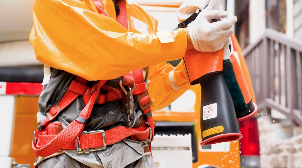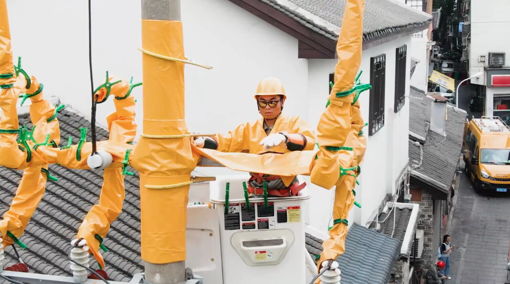 因為是不停電作業,喻暉要穿著密不透風的絕緣“鎧甲”,佩戴安全帽、絕緣手套及護目鏡。