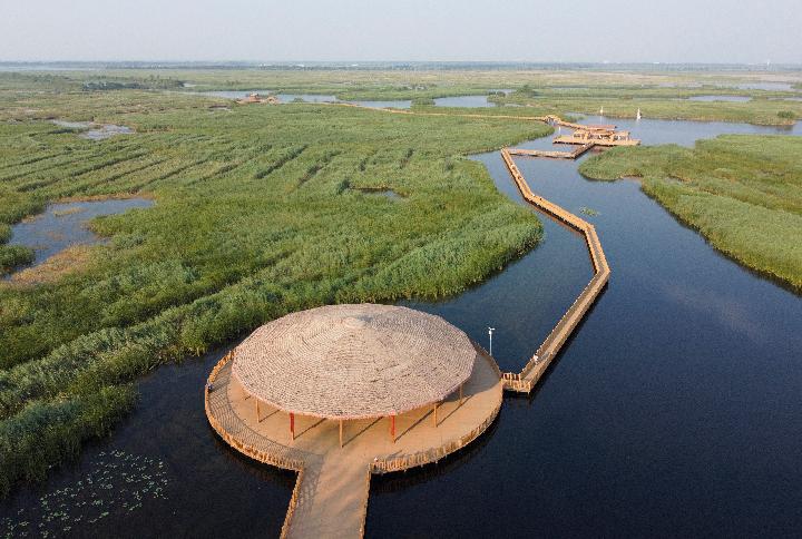 這是7月19日拍攝的白洋淀木棧道(無人機照片)。新華社記者郝建偉 攝
