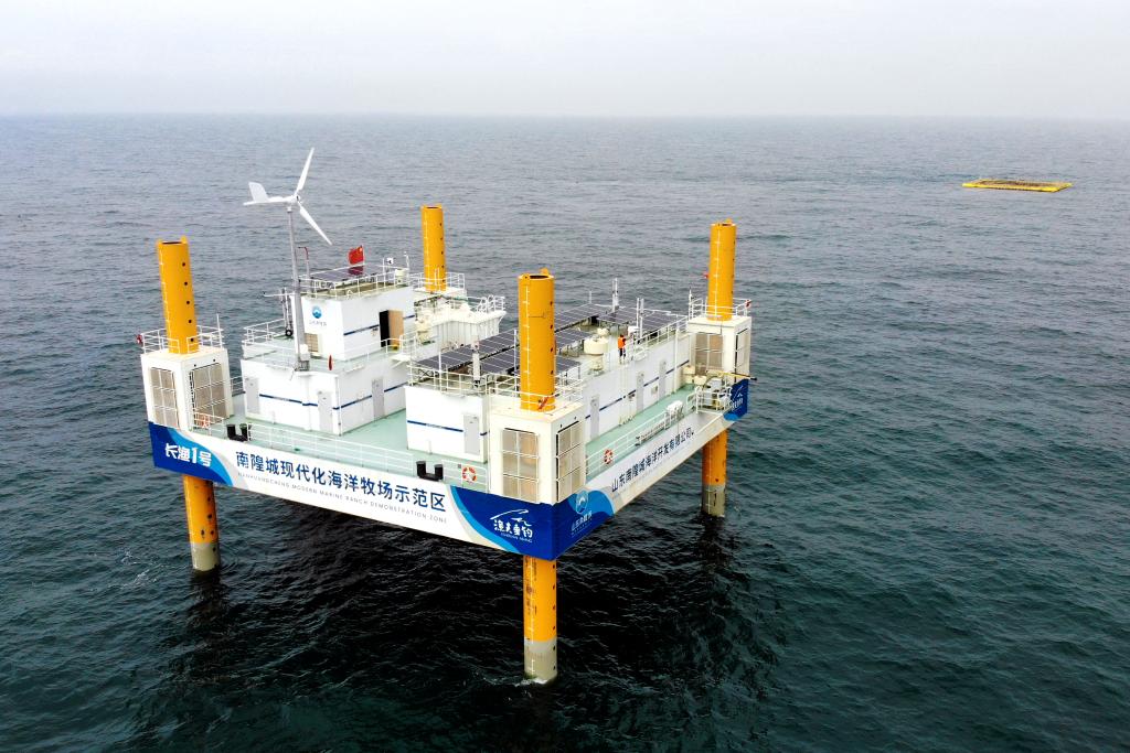 山東長島綜合試驗區南隍城國家級海洋牧場示范區海上平臺(無人機照片)。新華社記者王凱 攝