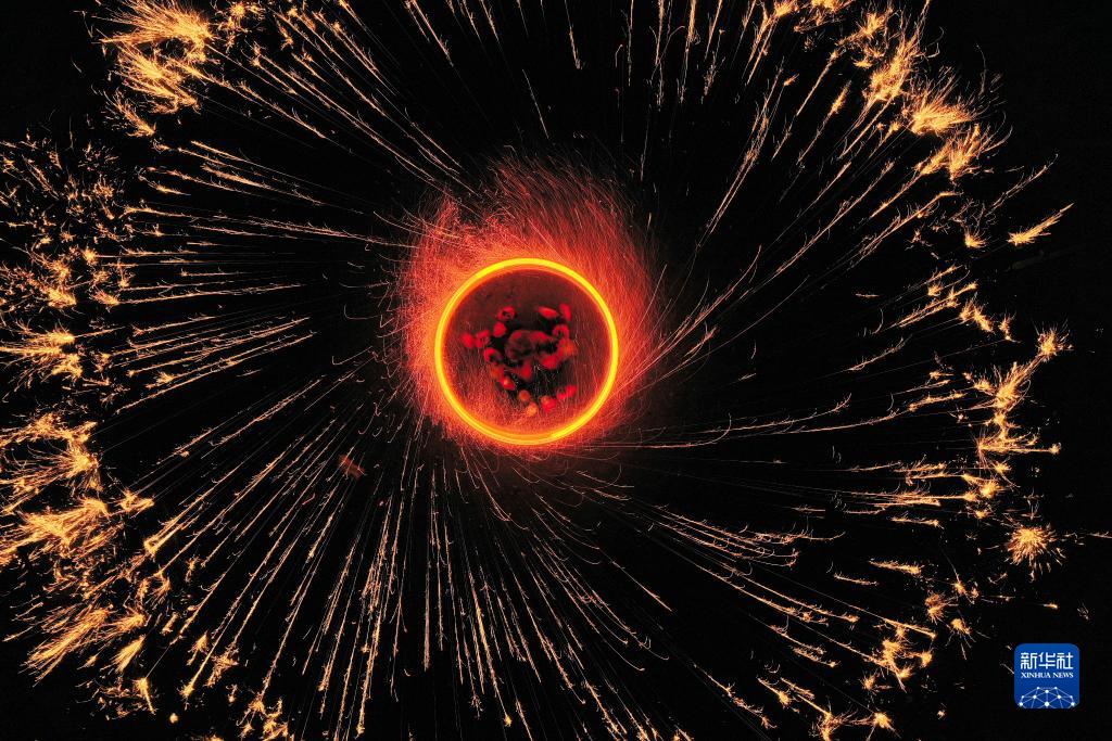 河北省灤平縣火斗山鎮大店子村的民間藝人在表演“掄花”(7月5日攝,無人機照片)。新華社記者 牟宇 攝