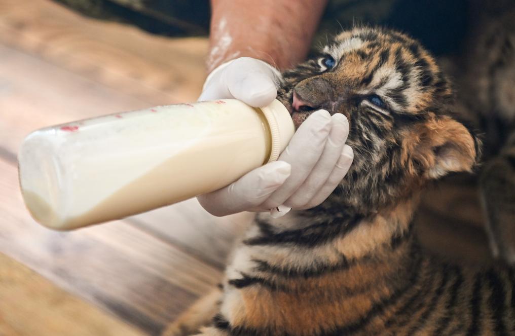 飼養員李鑫一會兒測量小老虎的體溫,一會兒給它們喂奶,密切觀測著“虎娃”們的動態,“為了保證小虎健康成長,我們每天都要嚴格消毒。如果有‘虎媽’奶水不足,會及時對小虎進行人工飼喂?!?/p>