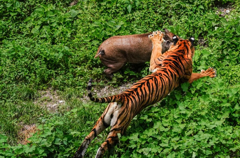 “為了不讓老虎飯來張口,我們想了很多辦法,滑輪送飯是其中一種。老虎在野外的時候,并不是每天都能吃上飯,為了保持它們對食物的欲望和野性,我們每周還給老虎‘辟谷’,讓它們斷食一天?!憋曫B員徐彪說,“你看,這兩只剛剛‘辟谷’后的老虎,吃飯是不是特別香?”