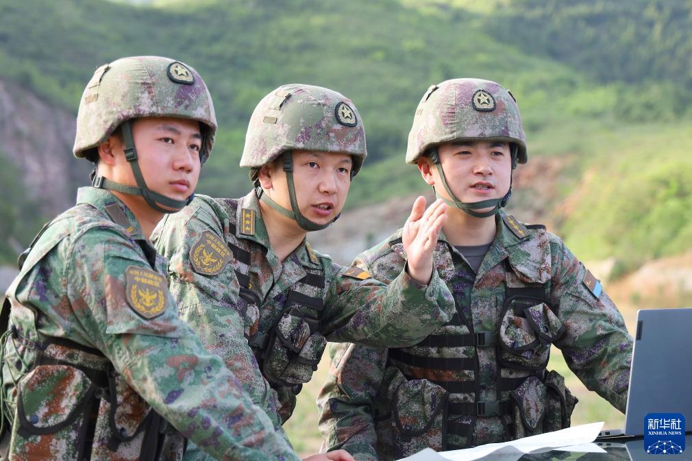 中部戰區某保障隊高級工程師袁偉(中)與團隊成員進行戰場勘察(6月2日攝)。新華社發(詹亨吉 攝)