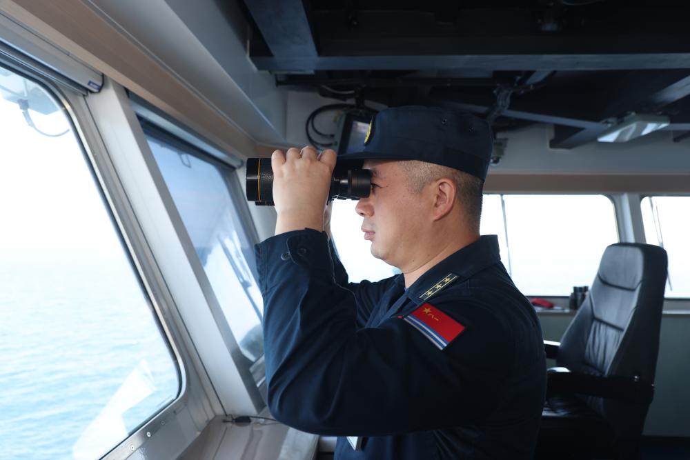 海上訓練中,中國自主研制的首艘兩棲攻擊艦海南艦艦長張美玉觀察??諔B勢(2月23日攝)。新華社發(喬晨曦 攝)