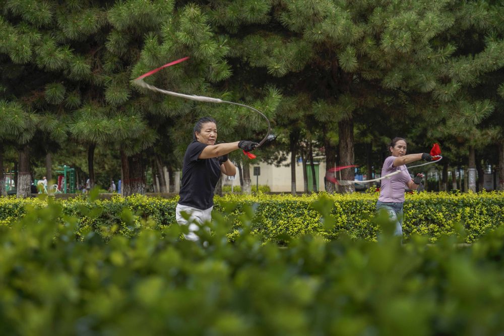 2023年8月6日,市民在河北省遵化市人民公園練習健身鞭。新華社發(劉滿倉攝)