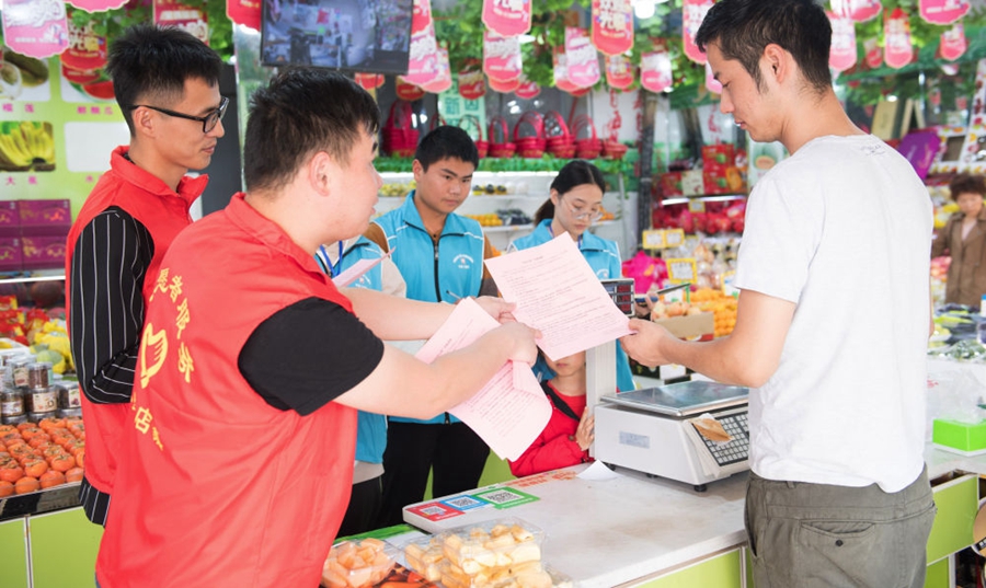 浙江省湖州市吳興區八里店鎮結合主題教育和“三服務”,推進“民生大走訪”工作機制,全體網格員下沉村、社一線,了解社情民意,化解矛盾糾紛,服務村社群眾。這是八里店鎮中心片區網格員(藍衣者)和志愿者(紅衣者)對一家店鋪進行平安問卷調查(2019年10月31日攝)。新華社記者 翁忻旸 攝