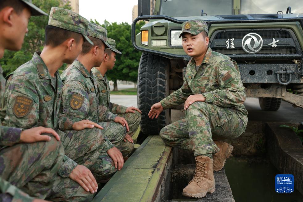 聯勤保障部隊某汽車團班長向躍東(右)在訓練場給戰友講解課目技巧(2023年6月27日攝)。新華社發(劉宇 攝)