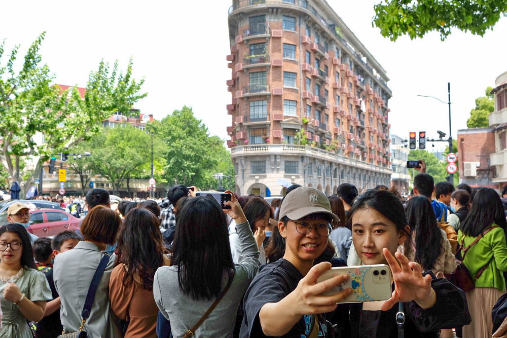游客在上海武康大樓前拍照留念(2023年4月30日攝)。新華社記者 辛夢晨 攝