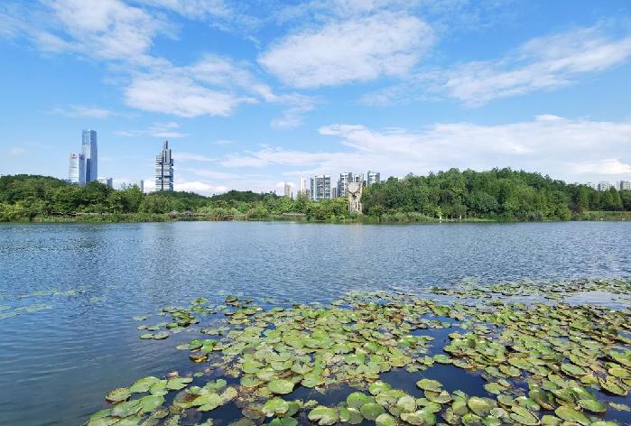 湖面清澈寬闊,荷花競相綻放,白鷺恣意歡鳴……在占地約5000畝的觀山湖公園里,這只是其中一角。