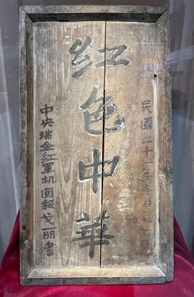 這是一塊寬30厘米、高55厘米,由樟木和雜木拼接而成的舊木匾。上面鐫刻著“紅色中華”四個大字,牌匾左側落款處清晰地寫著“中央瑞金紅軍機關報戈麗書”,右側時間為“民國二十一年冬月初七日”。