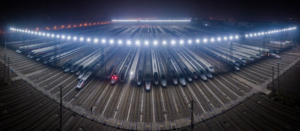 1月7日凌晨,動車組??吭谖錆h動車段的存車線上進行檢修和保溫作業(無人機拼接照片)。新華社記者 伍志尊 攝