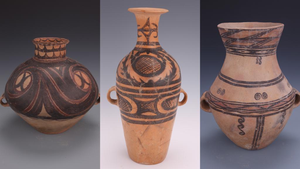 “這些彩陶最早可追溯至距今5000多年前,包括馬家窯文化、齊家文化、辛店文化等,見證了中華文明多元一體格局形成發展的演進歷程?!泵褡逦幕瘜m博物館館長陶穎介紹,其中,屬于仰韶文化石嶺下類型的變體鯢魚紋陶瓶,記錄了史前時期中原仰韶文化向西發展至甘青地區、衍化為馬家窯文化的歷史。