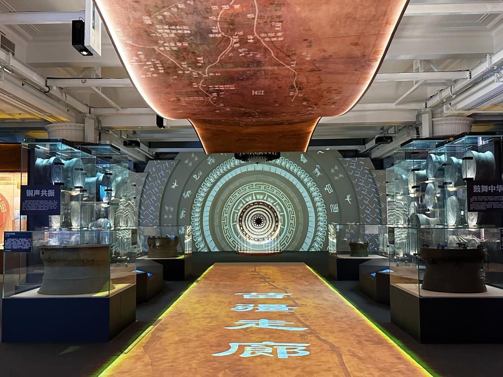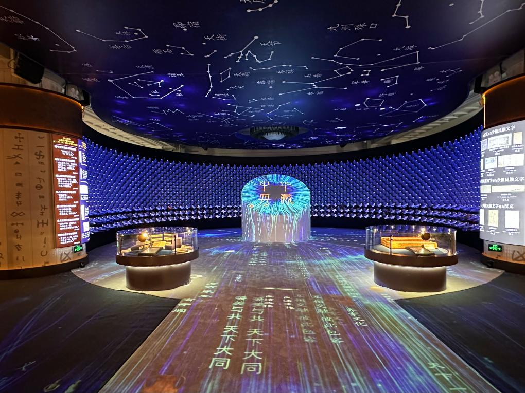 ——更沉浸。走進展廳,頭頂上方是古天文圖、古絲綢之路地圖,腳下則是流淌著一行行經典語錄的“中華文明之河”和“民族走廊”。