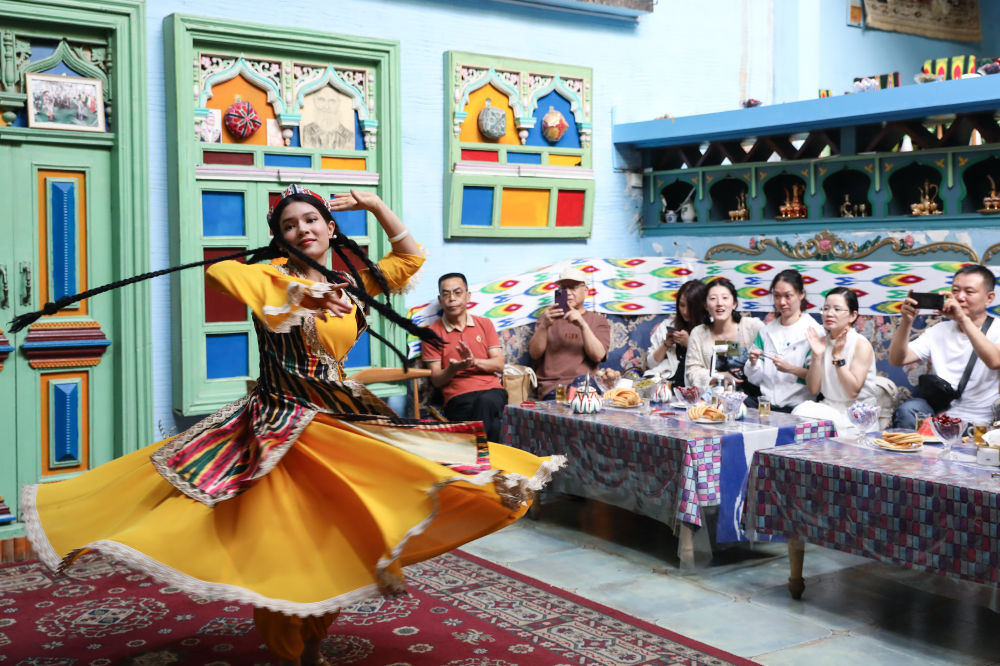 演員在新疆喀什古城景區“古麗的家”旅游家訪點表演舞蹈(2023年9月7日攝)。新華社記者 程婷婷 攝