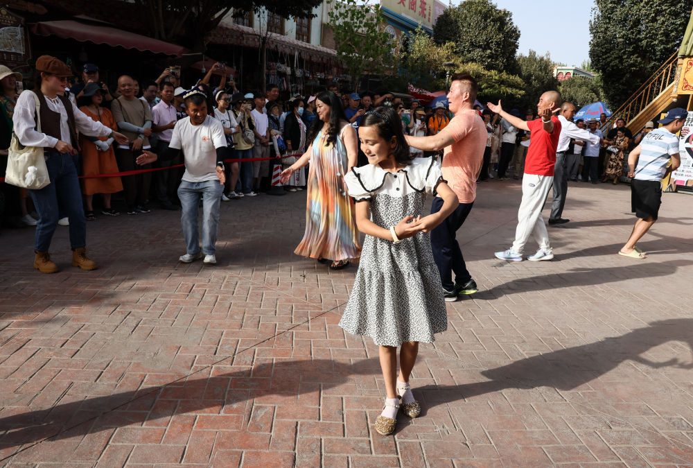 當地居民和游客在新疆喀什古城景區內隨音樂起舞(2023年9月7日攝)。新華社記者 蘭紅光 攝