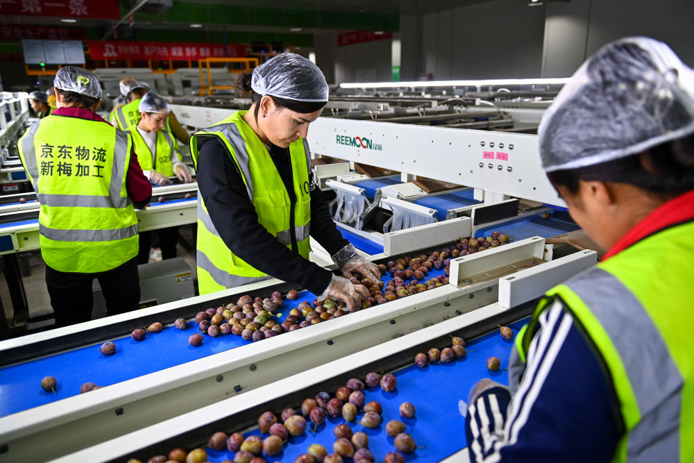 在新疆伽師縣粵伽新梅產業園內的京東物流新疆智能供應鏈中心,員工在智能分揀線檢查分選好的新梅(2023年8月30日攝)。新華社記者 丁磊 攝