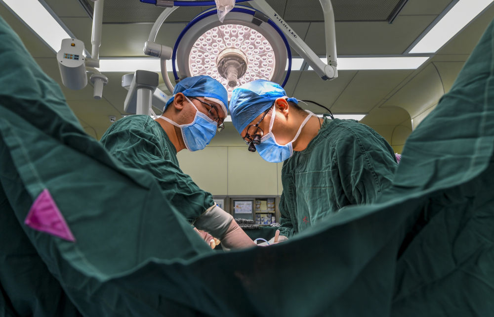 在新疆喀什地區第二人民醫院手術室,上海援疆醫生張俊文(右)和當地醫生阿迪力江為患者做二尖瓣置換手術(2018年11月23日攝)。阿迪力江是張俊文負責培養的年輕醫生之一。新華社記者 胡虎虎 攝