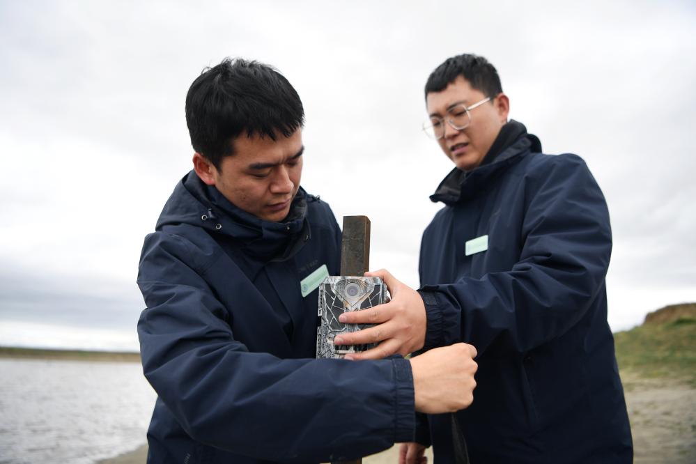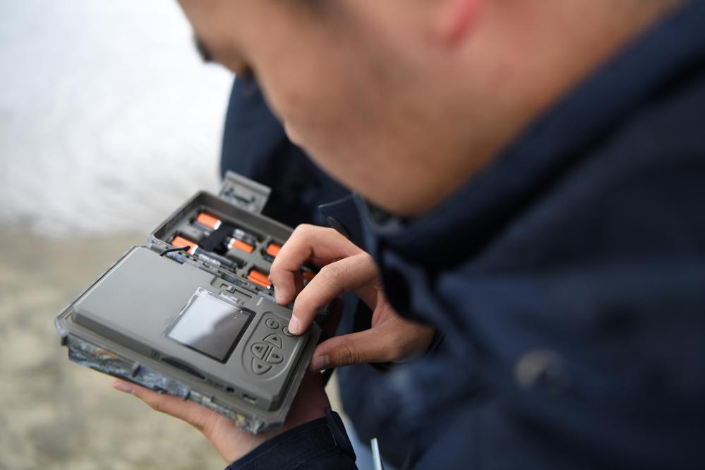 甘肅黃河首曲國家級自然保護區管護中心曼日瑪保護站的工作人員在保護區內檢查紅外相機的工作情況。 新華社記者 方欣 攝