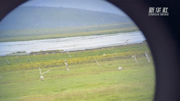 甘肅尕海則岔國家級自然保護區管護中心尕海保護站站長香毛吉(左一)和同事在保護區內用望遠鏡觀測野生動物。 新華社記者 陳斌 攝