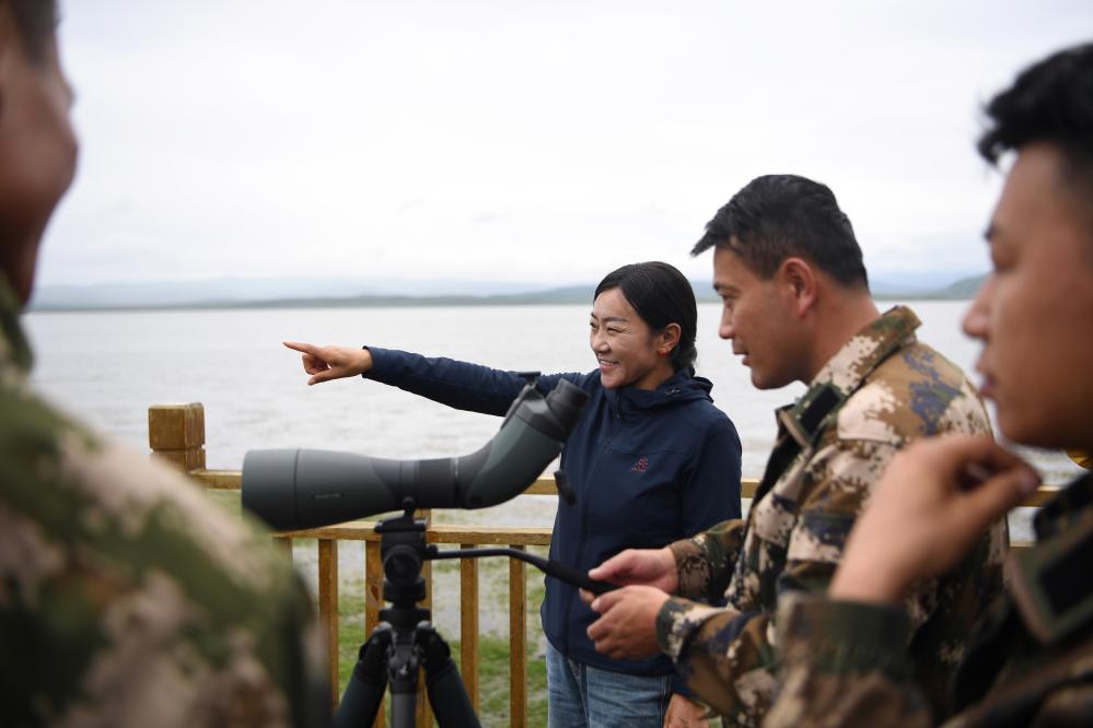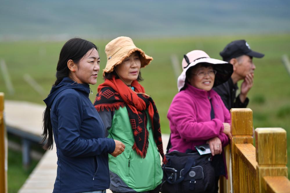 甘肅尕海則岔國家級自然保護區管護中心尕海保護站站長香毛吉(左一)向游客介紹保護區的野生動植物情況。 新華社記者 陳斌 攝