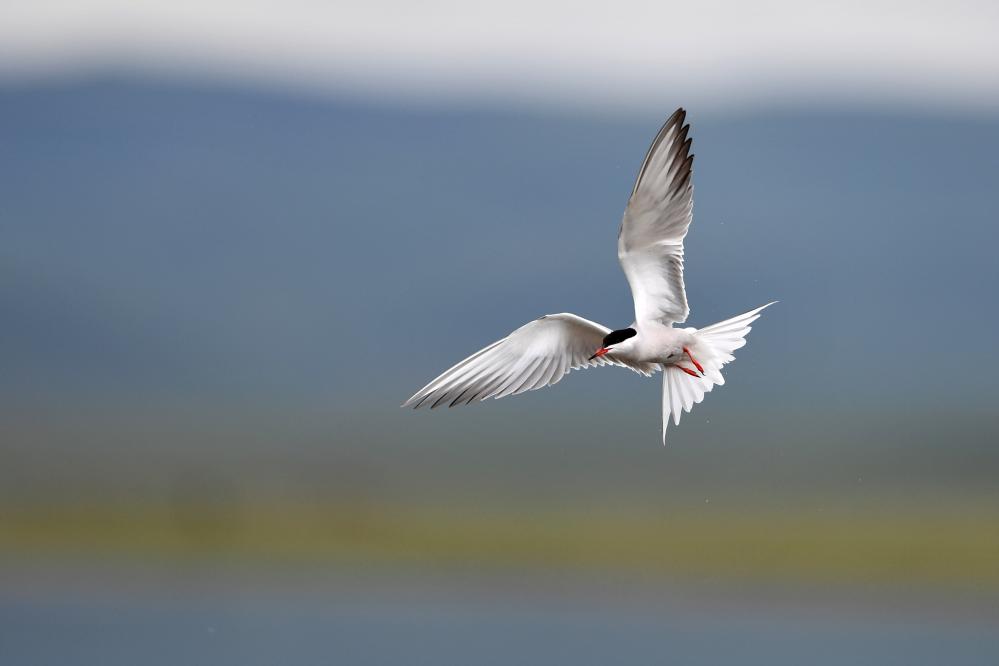 一只燕鷗在甘肅尕海則岔國家級自然保護區的尕海濕地上飛翔。 新華社記者 陳斌 攝