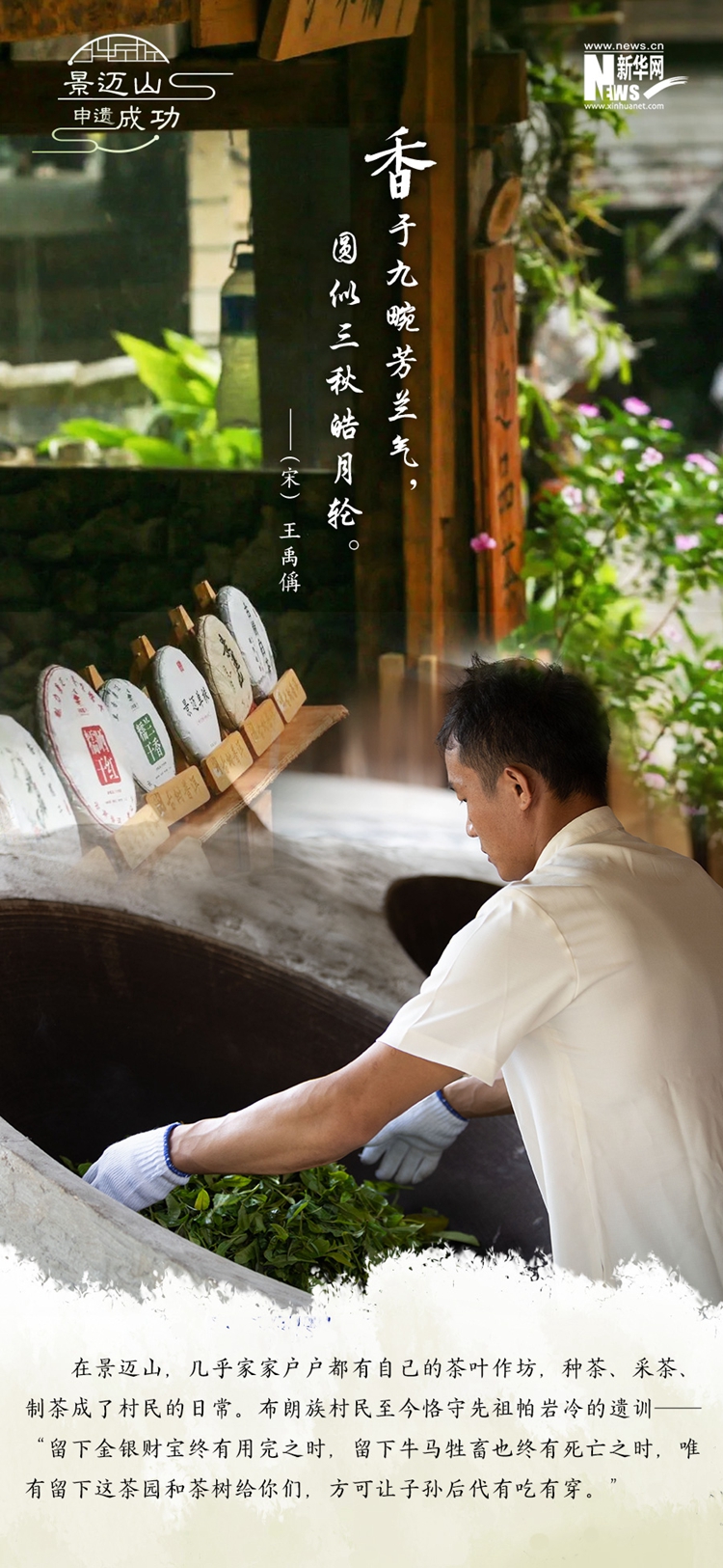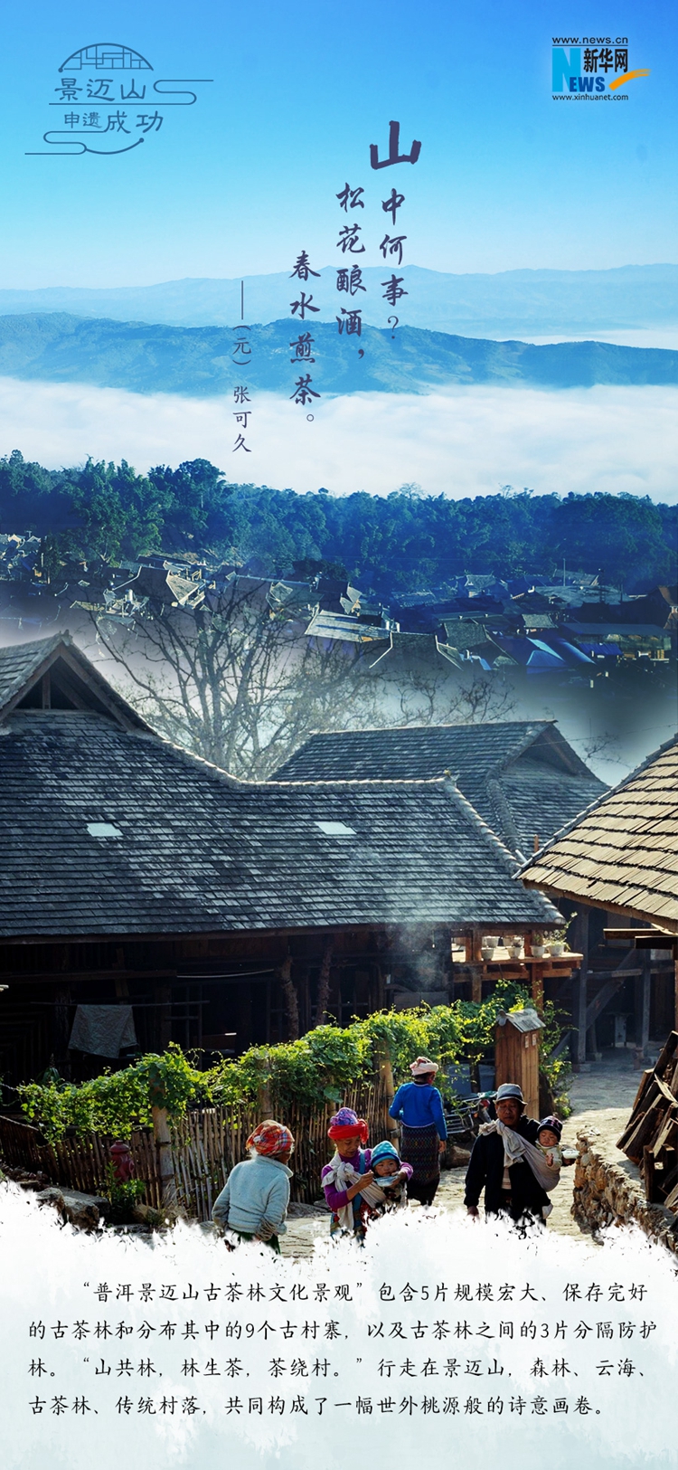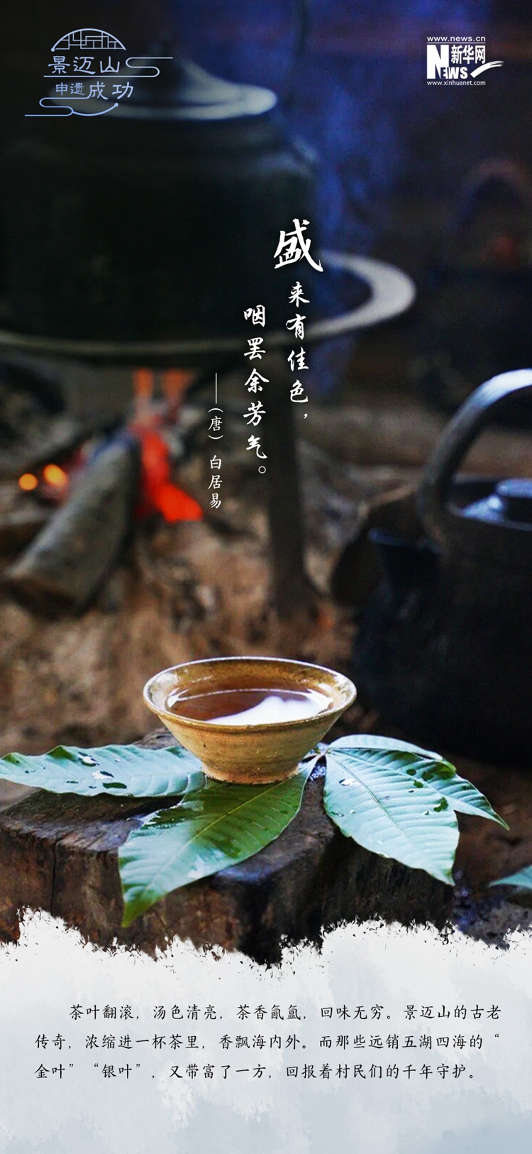 千百年來,生活在景邁山的布朗族、傣族先民以古茶林為核心,對山區土地集約利用和合理布局,創造了“茶在林中”“村在茶中”“人茶共生”的智慧型山地人居環境。景邁山的古老傳奇,濃縮進一杯茶里,香飄海內外。而那些遠銷五湖四海的“金葉”“銀葉”,又帶富了一方,回報著村民們的千年守護。