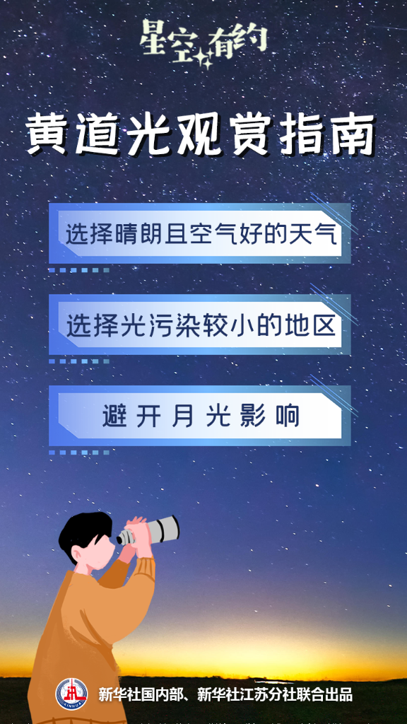 觀賞黃道光有一定技巧。王科超建議,首先應盡量選擇晴朗且空氣質量良好的天氣觀賞,這時大氣透明度較高。其次,應選擇光污染較小的地區觀賞。第三,還要避開月光的影響。今年秋分前后幾天,月光不會對觀測產生影響,對觀賞非常有利。