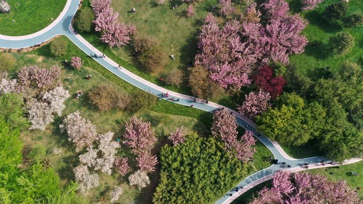 4月9日,游客在河北省石家莊市欒城區櫻花公園休閑游玩(無人機照片)。新華社記者 駱學峰 攝