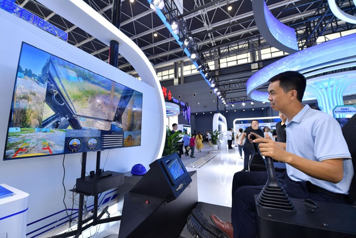 9月7日,參觀者在河北省石家莊舉行的2023中國國際數字經濟博覽會上體驗挖掘機5G遠程駕駛系統。新華社記者 駱學峰 攝