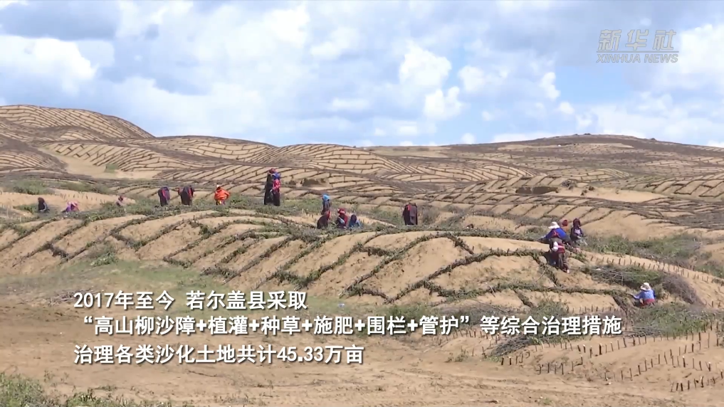 位于黃河上游的四川省阿壩州若爾蓋縣地處川西高原向青藏高原過渡地帶,曾因多種原因一度飽受“沙化”之苦。2017年至今,若爾蓋縣采取“高山柳沙障+植灌+種草+施肥+圍欄+管護”等綜合治理措施,治理各類沙化土地共計45.33萬畝,“編織”出一幅黃河邊沙化治理新畫卷。