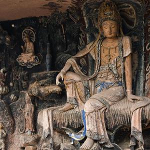 在毗盧洞景區,有一座聞名遐邇的“蹺腳觀音”造像:不同于常見的觀音造像,這座觀音左腳懸于臺外、右腳蹺起,隨意而坐,神態倜儻,顯得瀟灑自如,悠然自得?!败E腳而立,改變了北方石窟傳統造像正襟危坐、端莊典雅的形象,令人感到非常親民?!睏钚銈フf。