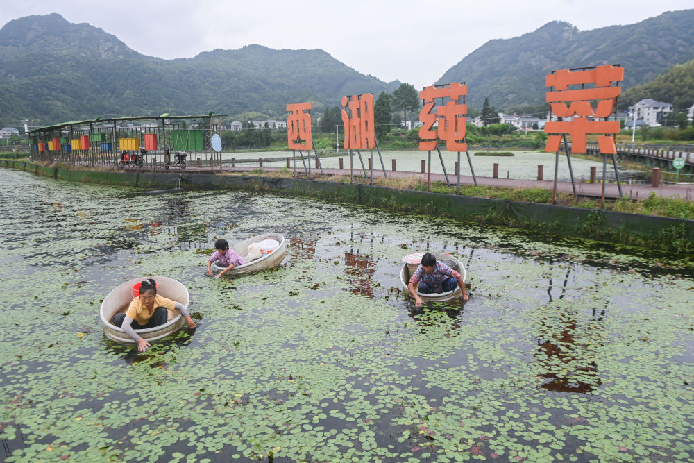 9月5日,在浙江省建德市航頭鎮烏龍村莼菜基地,村民劃著“盆船”在西湖莼菜產業園種植基地的水面上采摘西湖莼菜。近年來,浙江建德市航頭鎮以黨建聯建為紐帶,圍繞轄區特色農業產業園建設,發揮新鄉賢、鄉土人才、農創客作用,在烏龍村投資600余萬元新建了占地1900平方米的西湖莼菜產業園,引導新鄉賢爭當農業致富帶頭人,打造西湖莼菜共富工坊。新華社記者 徐昱 攝