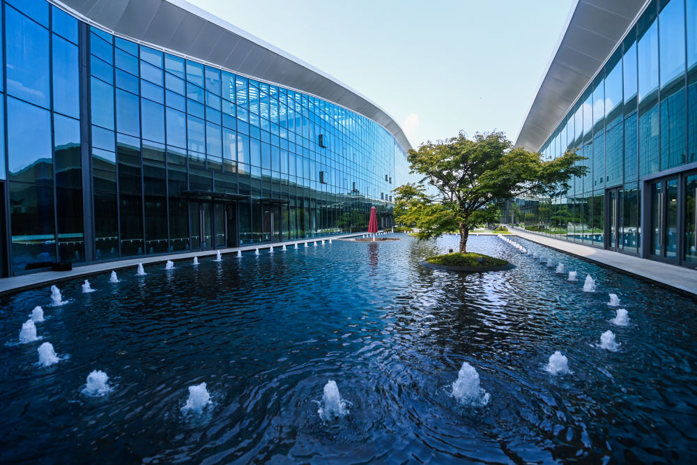 這是杭州富陽水上運動中心的中庭花園(8月24日攝),水池中的水來自于循環利用的雨水。新華社記者 徐昱 攝