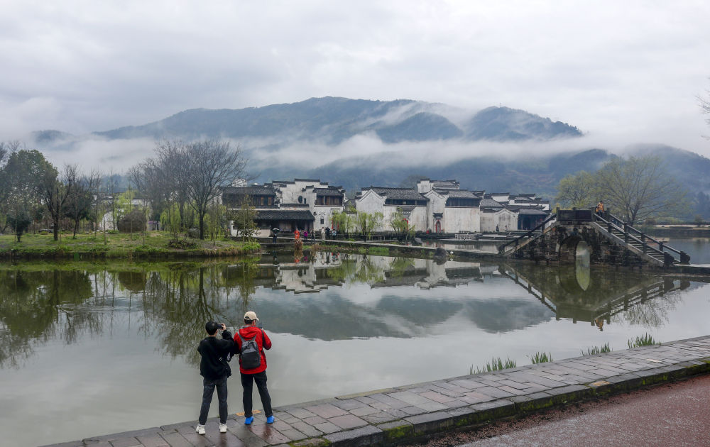 3月22日,游客在安徽省黃山市徽州區呈坎古村欣賞雨后春景。新華社發(施亞磊 攝)