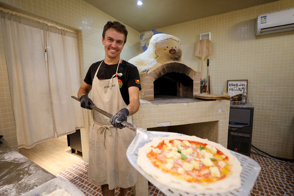 9月12日,在安徽省黃山市屯溪區南溪南村“卓文的小食堂”,美國人卓文展示制作的披薩。新華社發(樊成柱 攝)