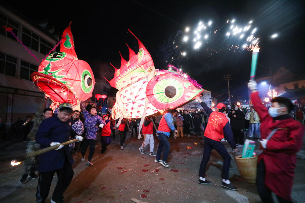 2月3日,在安徽省黃山市歙縣溪頭鎮汪滿田村,人們嬉魚燈。新華社發(樊成柱 攝)