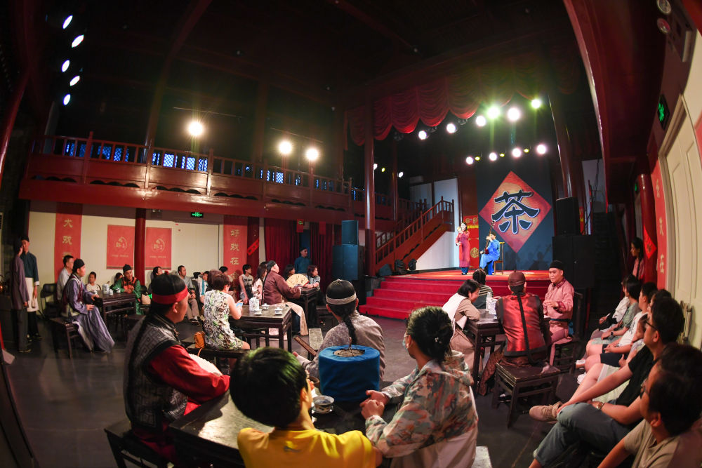 在北京市東城區顏料會館,觀眾在欣賞由北京市曲劇團演員帶來的沉浸式北京曲劇《茶館》(7月7日攝)。新華社記者 鞠煥宗 攝