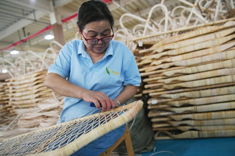 工作人員在位于漢中市的陜西良順匠心實業有限公司編織藤制品(2023年9月7日攝)。新華社記者 張曼怡 攝