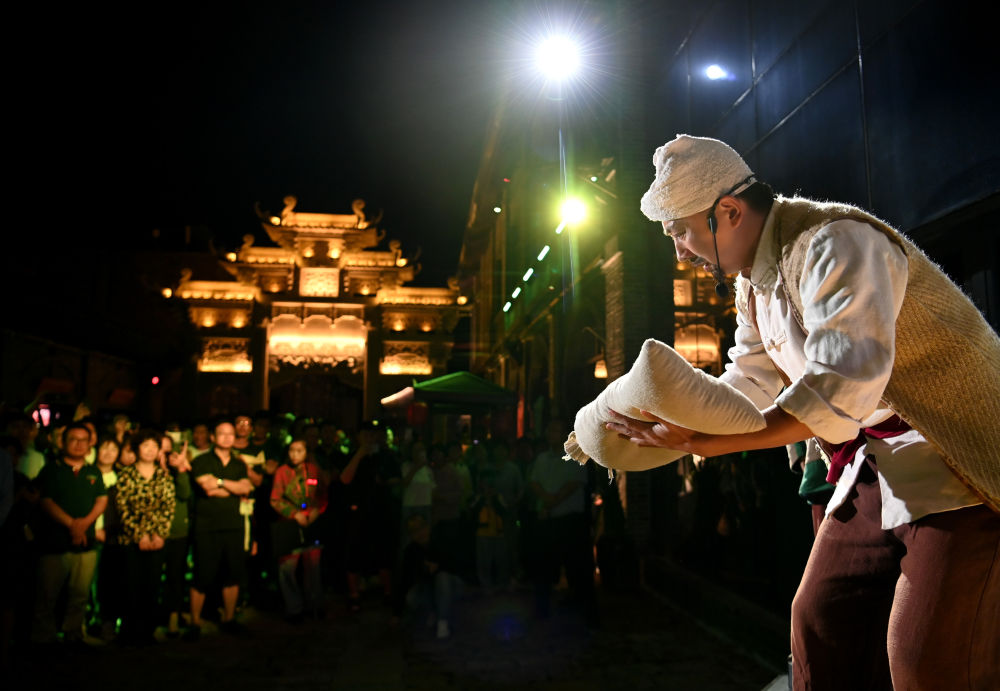 游客在長安十二時辰主題街區觀看唐風演藝《將進酒》(2023年8月2日攝)。新華社記者 鄒競一 攝