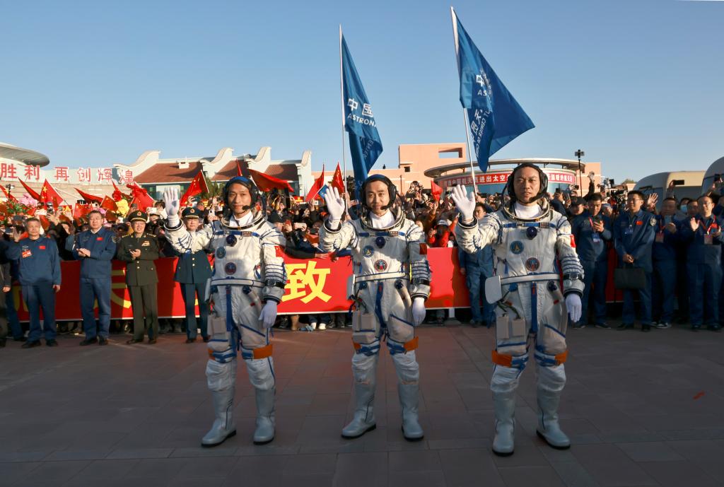 10月26日上午,神舟十七號載人飛行任務航天員乘組出征儀式在酒泉衛星發射中心問天閣圓夢園廣場舉行。這是航天員湯洪波(右)、唐勝杰(中)、江新林在出征儀式上。新華社記者 李剛 攝