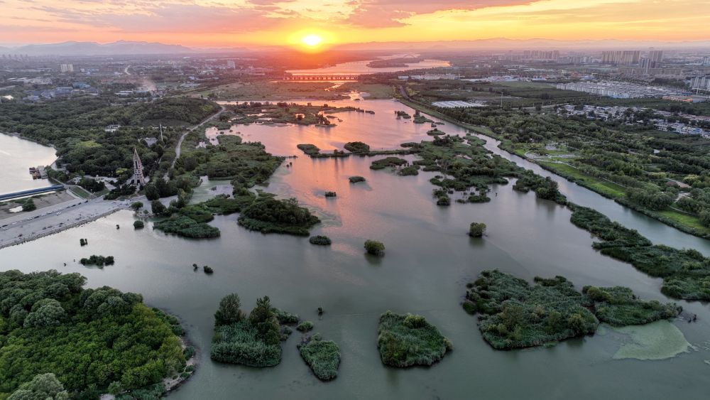 夕陽下的滹沱河石家莊段(2023年7月15日攝,無人機照片)。新華社記者 朱旭東 攝